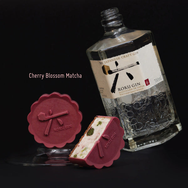 Roku Gin cherry blossom ice cream swirled with cherry jam and matcha sponge cake, encased in a ruby chocolate shell with an almond praline feuilletine base